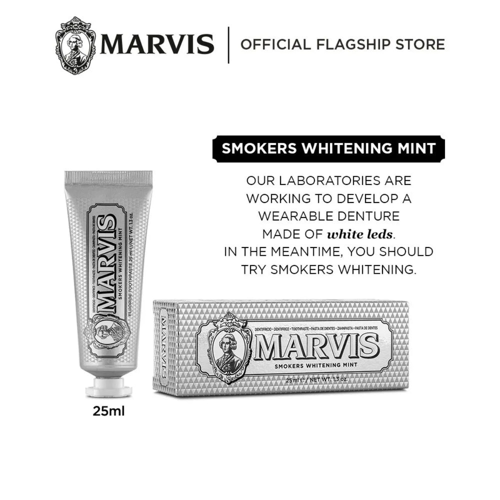 Marvis Smokers Whitening Mint 25 ml is a premium Italian toothpaste in travel-size format. With a special polymer to gently lift stains from smoking and dark beverages, plus cavity-fighting fluoride and xylitol, it delivers a dense, vegan-friendly paste and invigorating cool mint freshness. Made in Italy, free from preservatives and animal-derived ingredients.