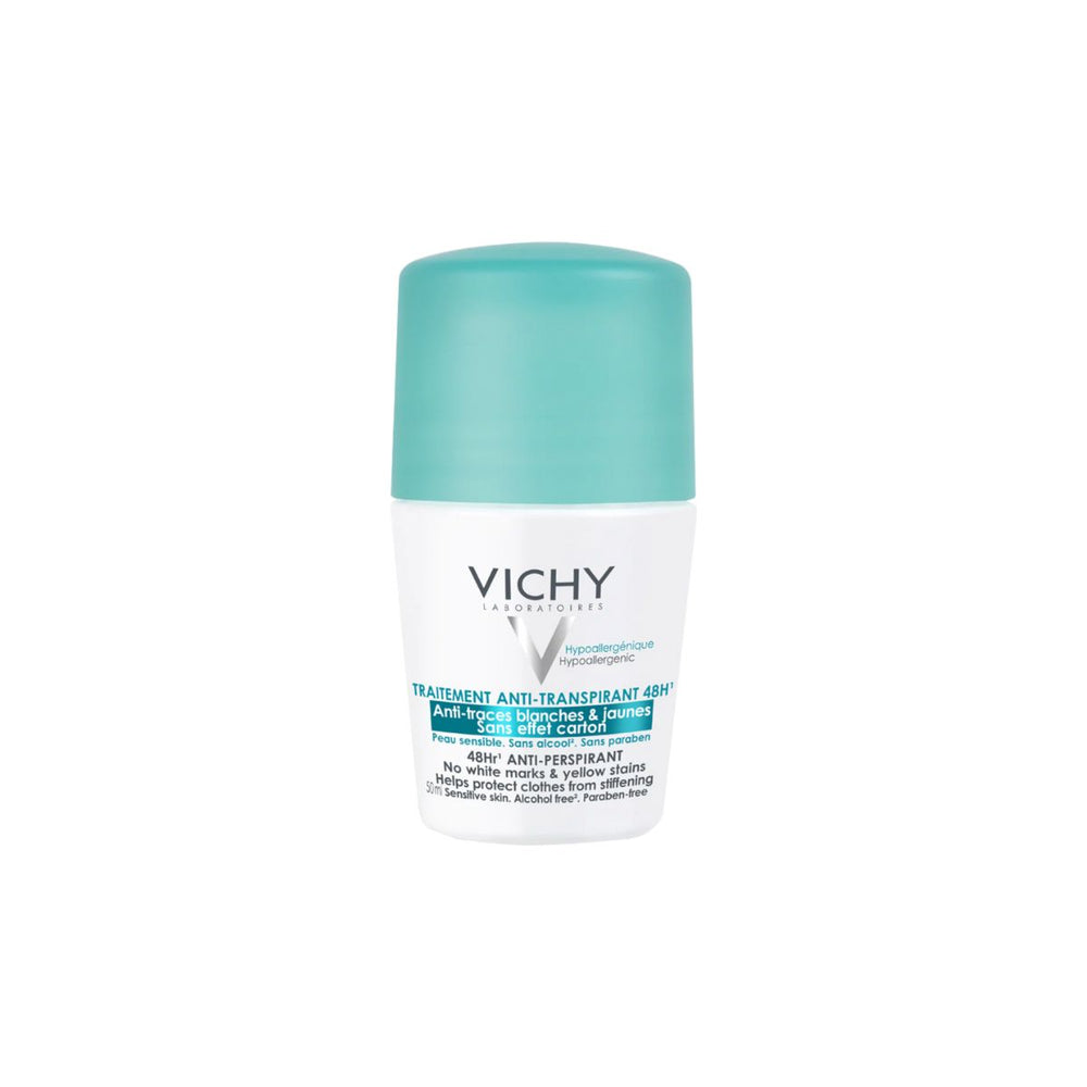 Vichy Traitement Anti‑Transpirant 48H Roll‑On offers intensive protection against excessive perspiration while remaining gentle on the skin. Formulated with powerful anti-perspirant agents and enriched with Vichy Mineralizing Thermal Water, it provides 48-hour sweat and odor control without causing irritation.